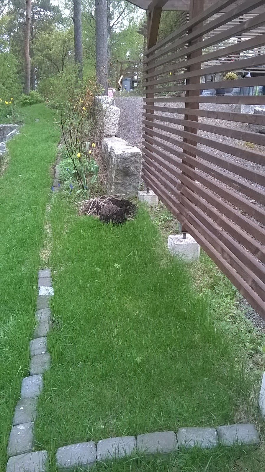 Kuorin kuokalla nurmikon pois. Se lähtikin ihanan isoina paloina kosteasta maasta. Sitten kuokin reunakiville sopivan syvänteen ja asetin ne paikoilleen. Aikaa meni tunti!